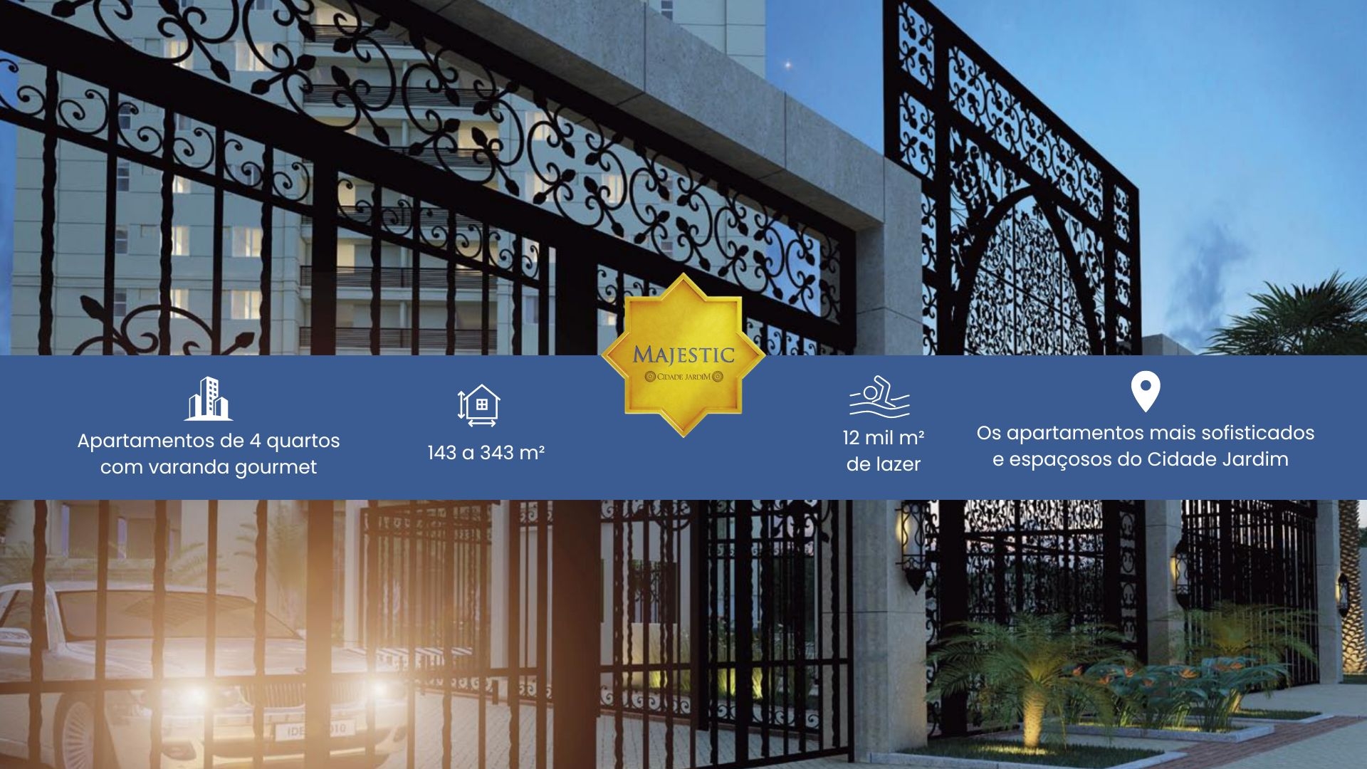 O Majestic apresenta uma fachada em design contemporâneo que impressiona por sua beleza e singularidade, e seu projeto se inspirou na cultura árabe oriental para elaborar espaços internos que refletissem elegância e bom gosto. Além das áreas externas com jardins e lazer completo, o condomínio faz uso de soluções tecnológicas para assegurar a proteção de todos.